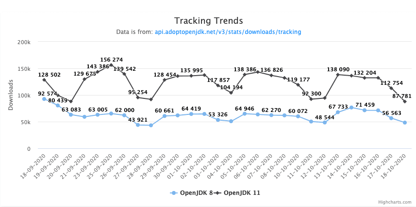 As you can see, OpenJDK 8 is still the most downloaded binary of all time, BUT not for long now because OpenJDK 11 consistently gets more downloads than OpenJDK 8 each day.